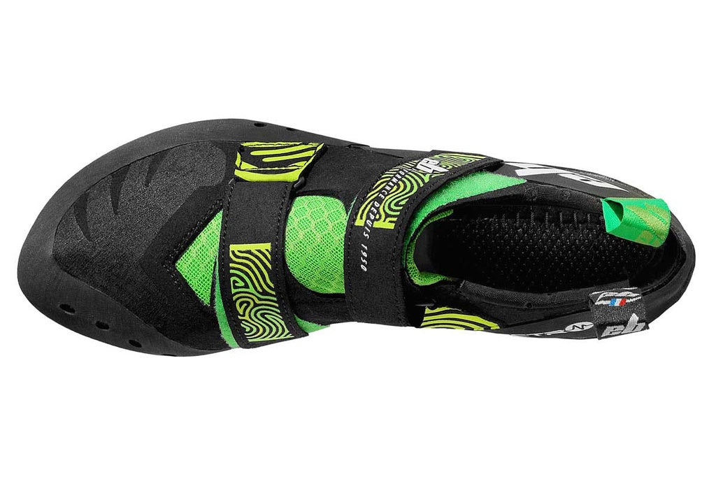 Sa tige en microfibre EVO épouse parfaitement le pied, tandis que le double velcro garantit un serrage sûr et rapide. L’ajout de fil d’argent antibactérien assure une hygiène optimale. La semelle en gomme Optimax offre une adhérence exceptionnelle, un bon rebond et une grande durabilité, aussi bien sur résine que sur rocher.