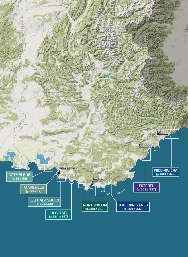 Spots répertoriés : Côte Bleue, Marseille, Calanques, La Ciotat, Port d’Alon, l’anse de San Peyre, la presqu’île de Giens, l’île de Porquerolles, le massif de l’Estérel, et enfin Nice et sa Riviéra.